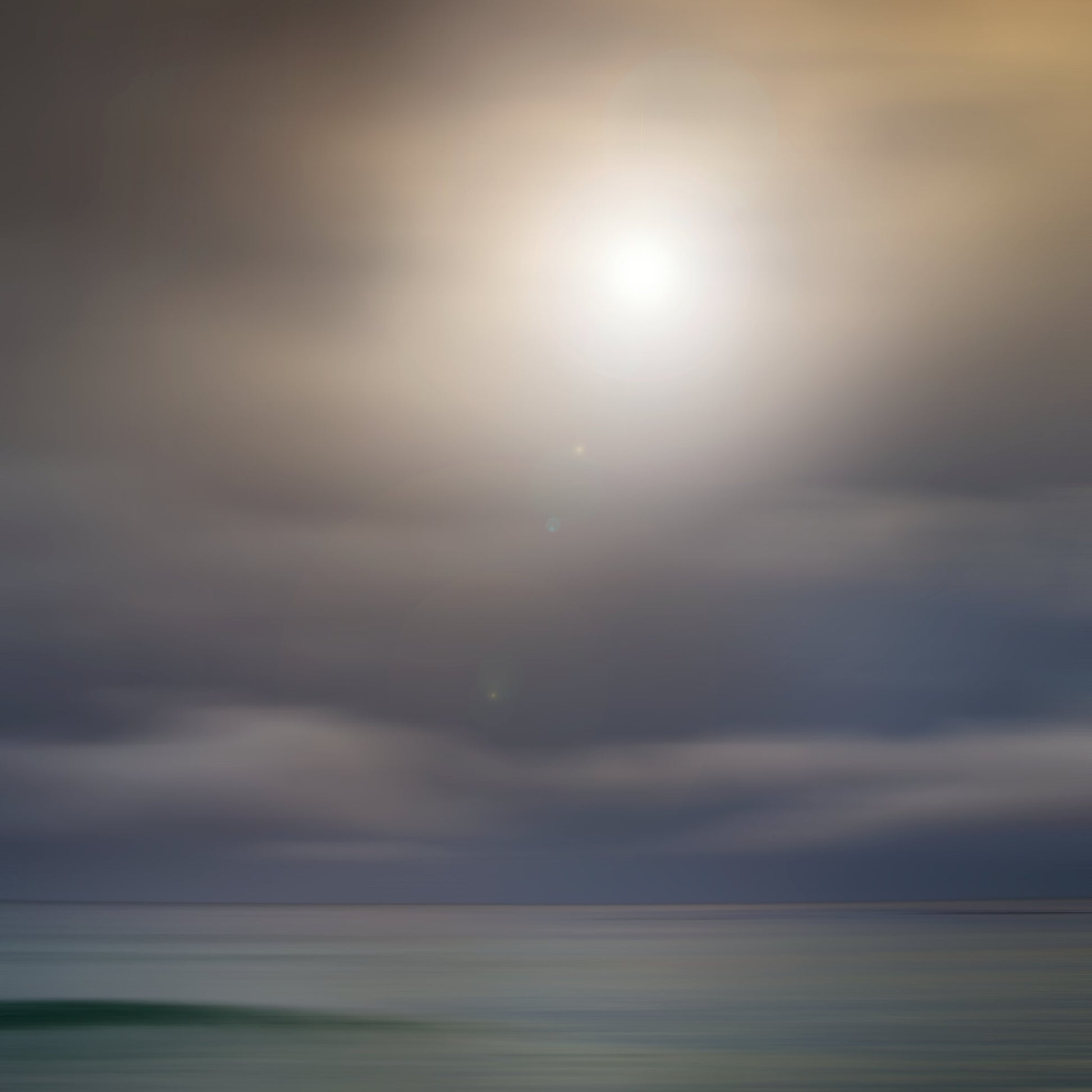 A dramatic, moody impression photographed over the ocean with the sun setting behind a stormy sky.