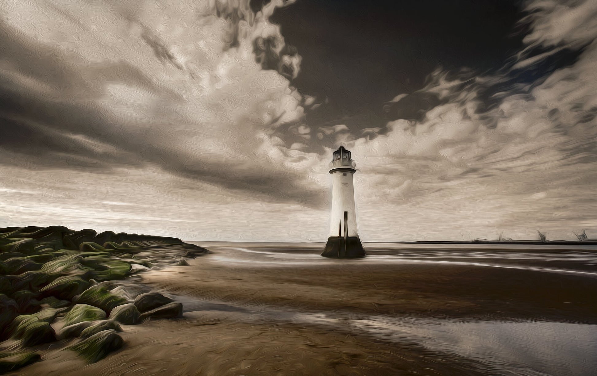 A lighthouse standing proud along the coastline is portrayed in a beautiful artistic abstract impression, created using various digital art techniques.