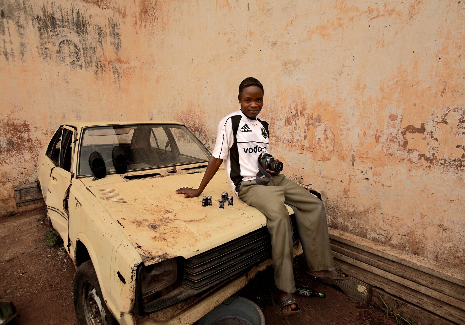 A proud young man shows off his new football shirt, camera and Everready batteries that he has just received as a birthday gift.