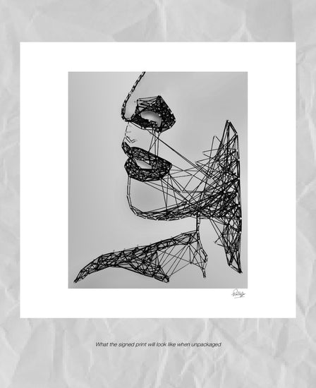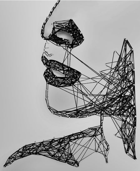 A stunning line artwork created using thread wound around nails, strategically placed onto a board to outline a lady’s facial profile.