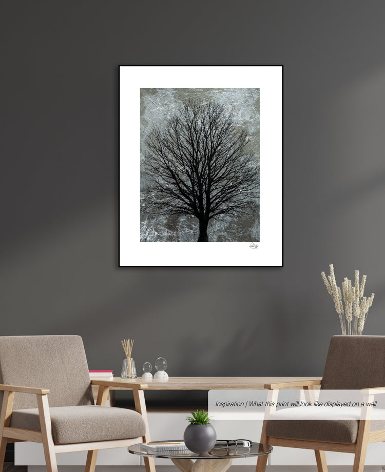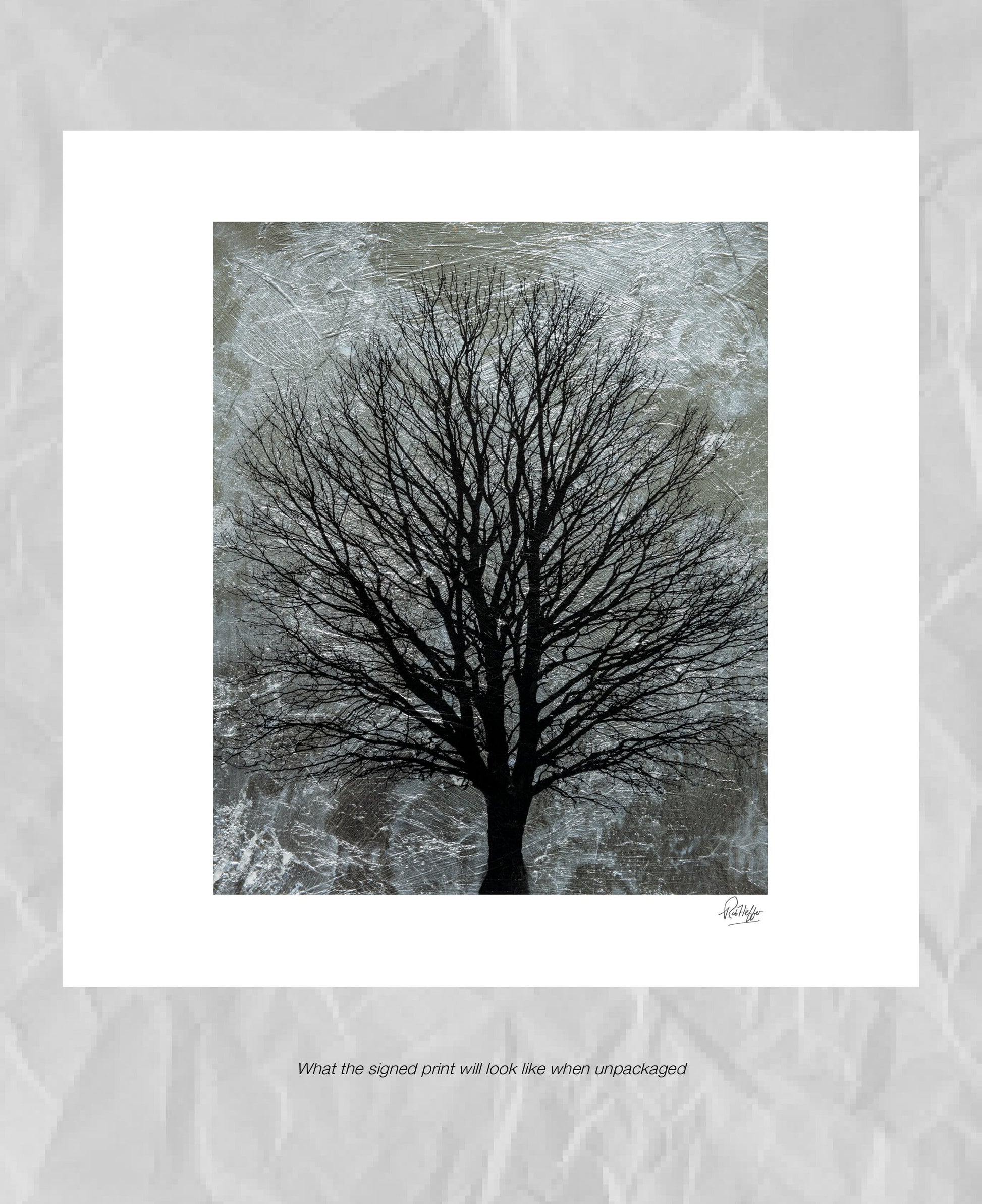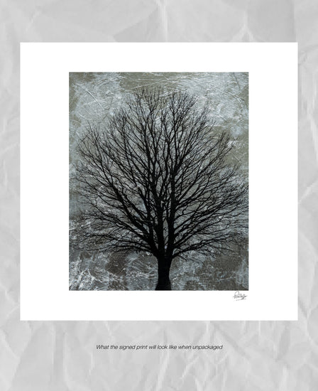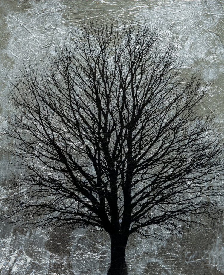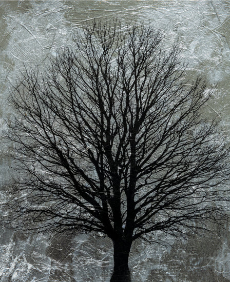 Photographic image of a lone tree transferred onto a silver leaf background.
