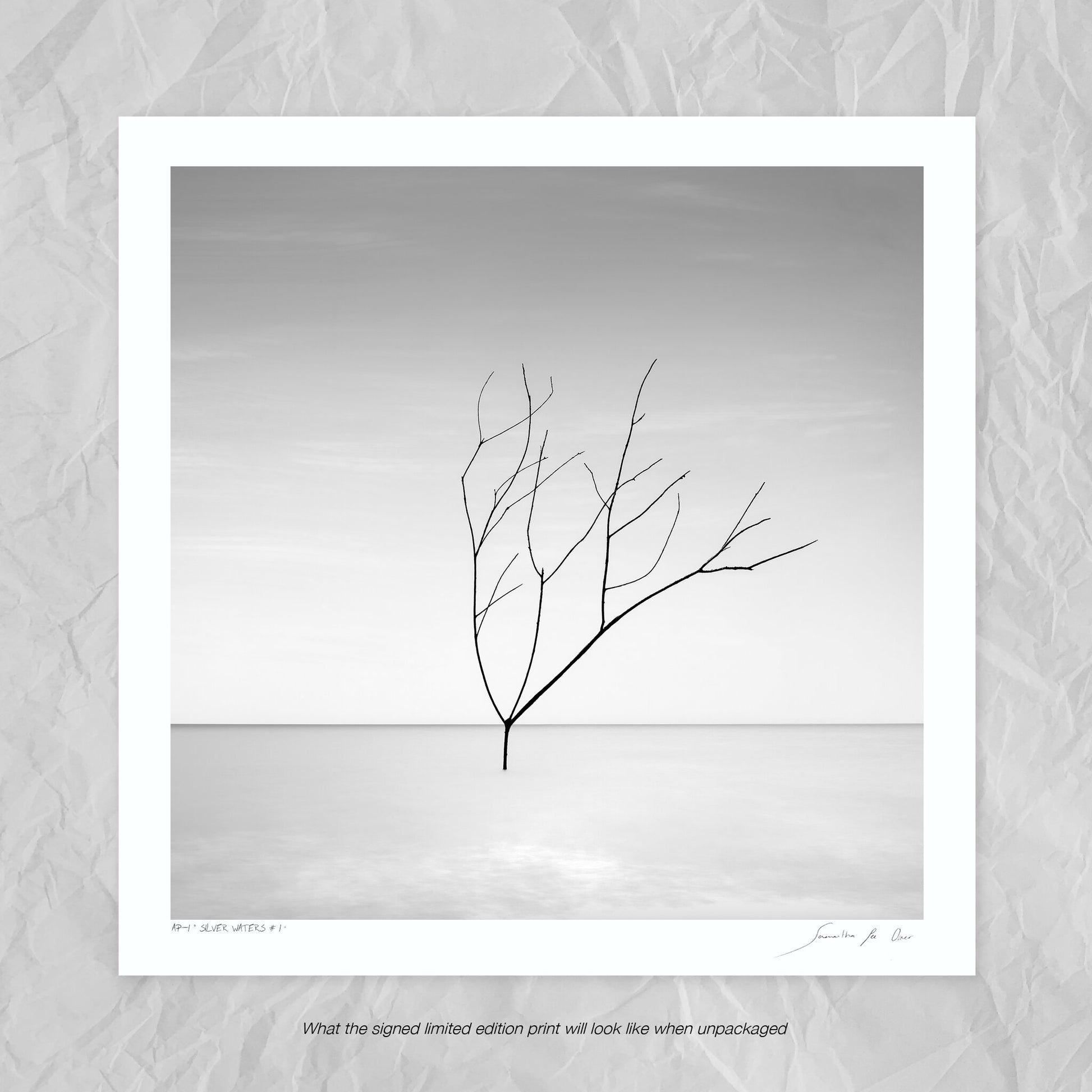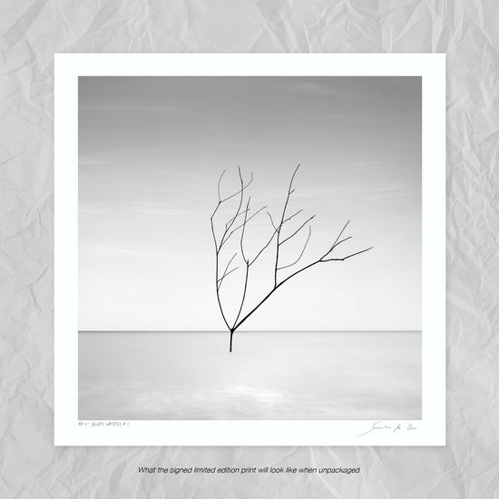 A captivating black and white print of a tree silhouetted against the soft texture of sill water and a dreamy sky, this artwork is a celebration of minimalistic photo art and forms part of the artists successful "Still Waters" portfolio with is available in two print sizes each limited in edition.