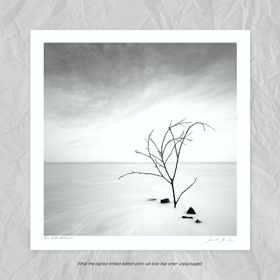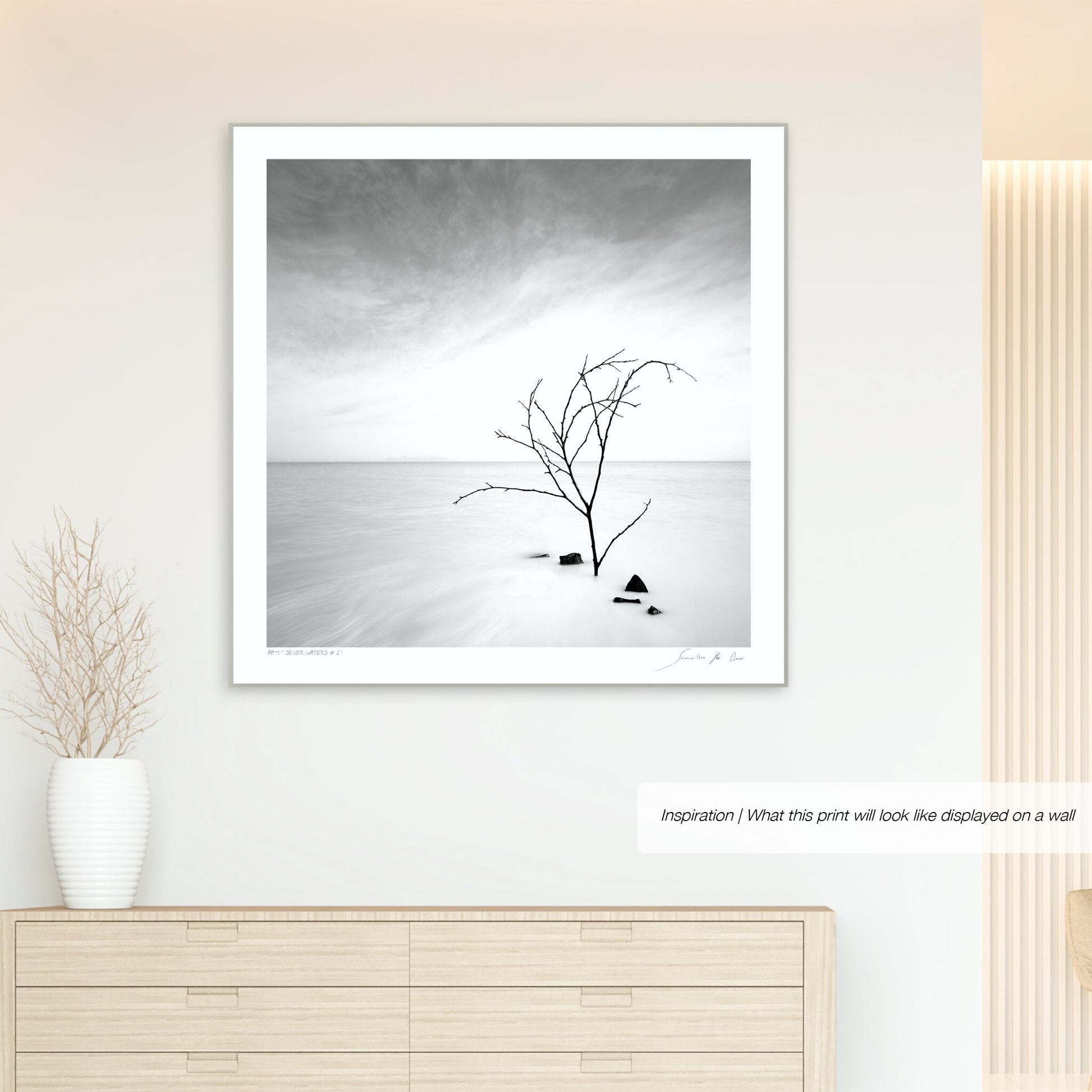 A captivating black and white print of a tree silhouetted against the soft texture of sill water and a dreamy sky, this artwork is a celebration of minimalistic photo art and forms part of the artists successful "Still Waters" portfolio with is available in two print sizes each limited in edition.