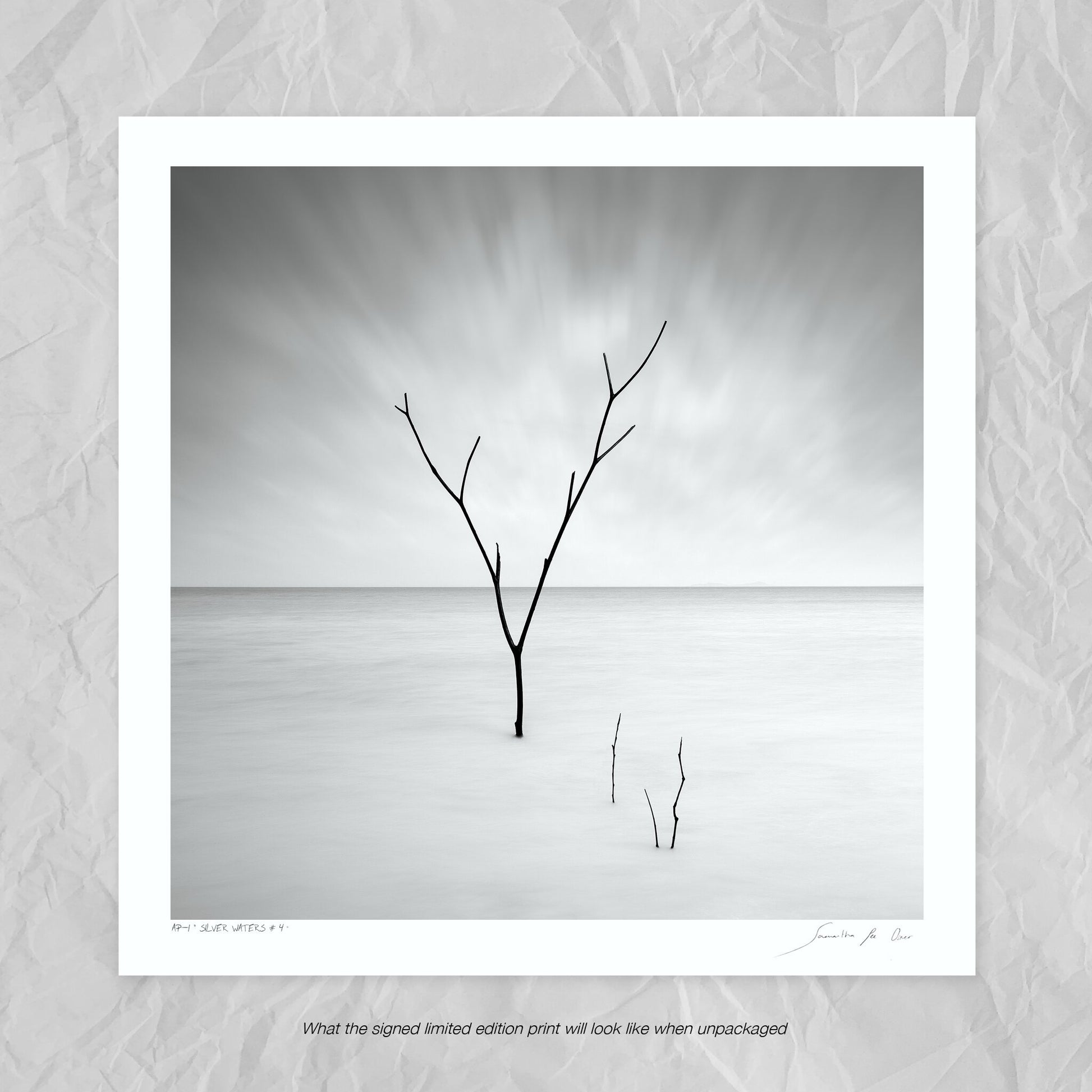 A captivating black and white print of a tree silhouetted against the soft texture of sill water and a dreamy sky, this artwork is a celebration of minimalistic photo art and forms part of the artists successful "Still Waters" portfolio with is available in two print sizes each limited in edition.