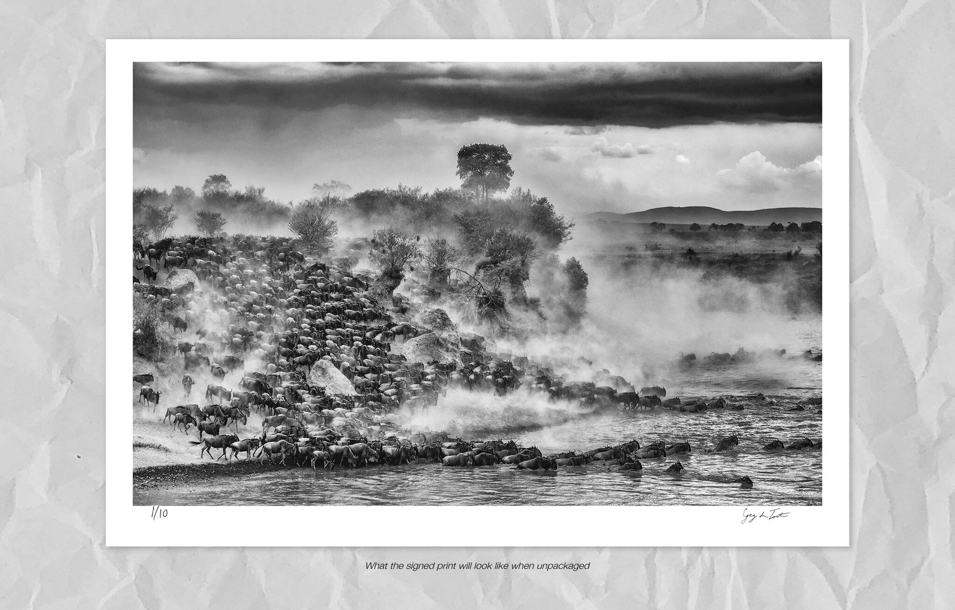 The Great Migration sees herds of wildebeest cross the Mara River in Kenya’s Masai Mara Game Reserve. Dust rises as the multitudes descend towards the crossing. This photograph is available for purchase in two different sizes, both limited to ten in the edition. The photographs are printed on high archival quality Ilford Galerie paper and are accompanied by a certificate of authenticity.