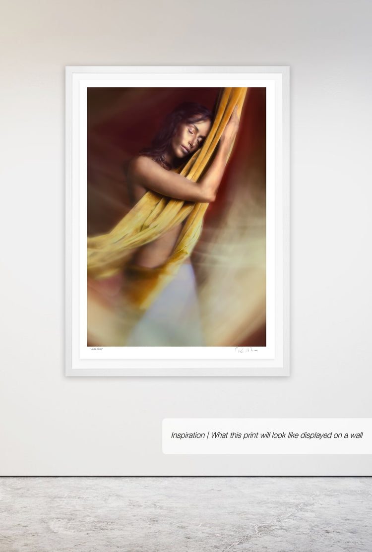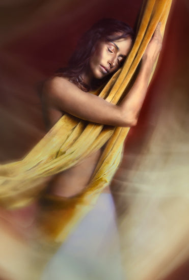 Transcendence, a masterpiece, dances with colours from Northern African traditions—vibrant yellows and rich burgundy. It explores vulnerability, angelic guidance, and protection. The warm light bathes the woman, creating an oasis of tranquility amid life's noise, symbolising belief and inner strength.